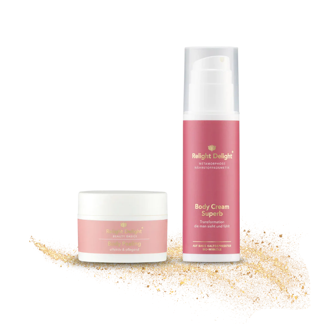 Das sanfte Body Peeling entfernt abgestorbene Hautzellen, regt die Durchblutung an und hinterlässt sofort ein glattes, frisches Hautgefühl. Anschließend verwöhnt die Metamorphose Superb Körpercreme die Haut mit hochwirksamen Wirkstoffen wie Ectoin®, Apfelstammzellen-Extrakt, Ceramiden, Squalan, Sheabutter und kaltgepressten Bio-Ölen. Sie unterstützt die Zellerneuerung, schützt vor oxidativem Stress, spendet intensive Feuchtigkeit durch Hyaluronsäure und erhält die Elastizität der Haut. Vitamin E wirkt antioxidativ und stärkt die Haut zusätzlich gegen Umwelteinflüsse. Die seidige Textur der Creme verschmilzt mit der Haut und hinterlässt ein spürbar geschmeidiges, gepflegtes Hautgefühl.